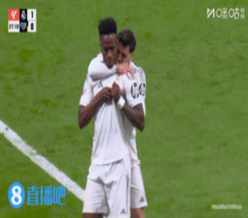 进球后维尼修斯亲吻皇马队徽!↓
